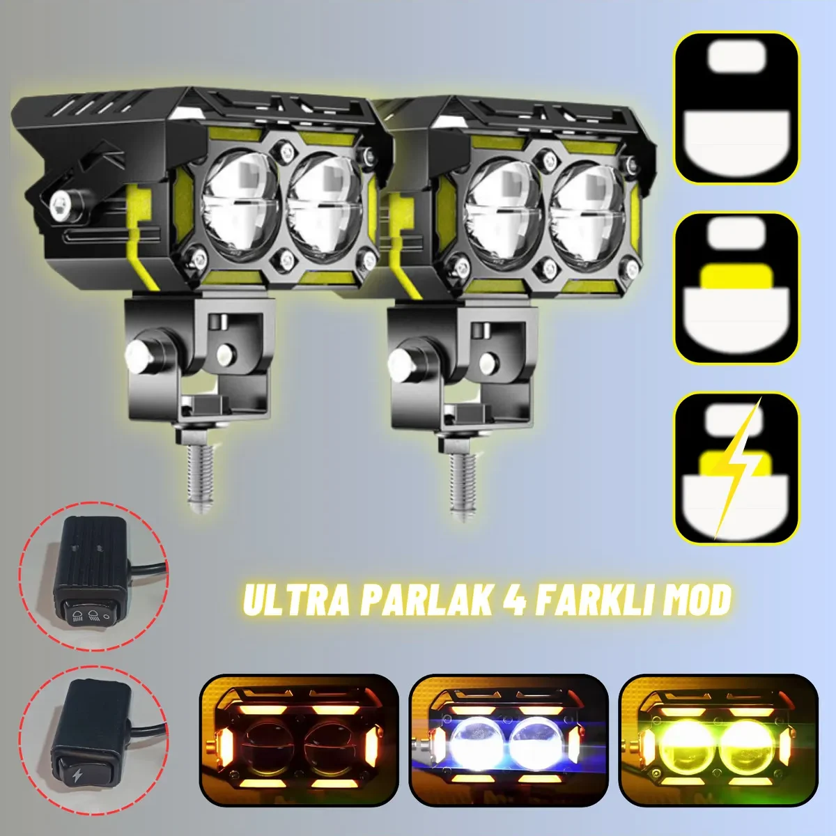 LED DRL Sinyalli Motosiklet Sis Farı Çakarlı Çift Renk 4 Modlu Delici Yüksek Performans Set